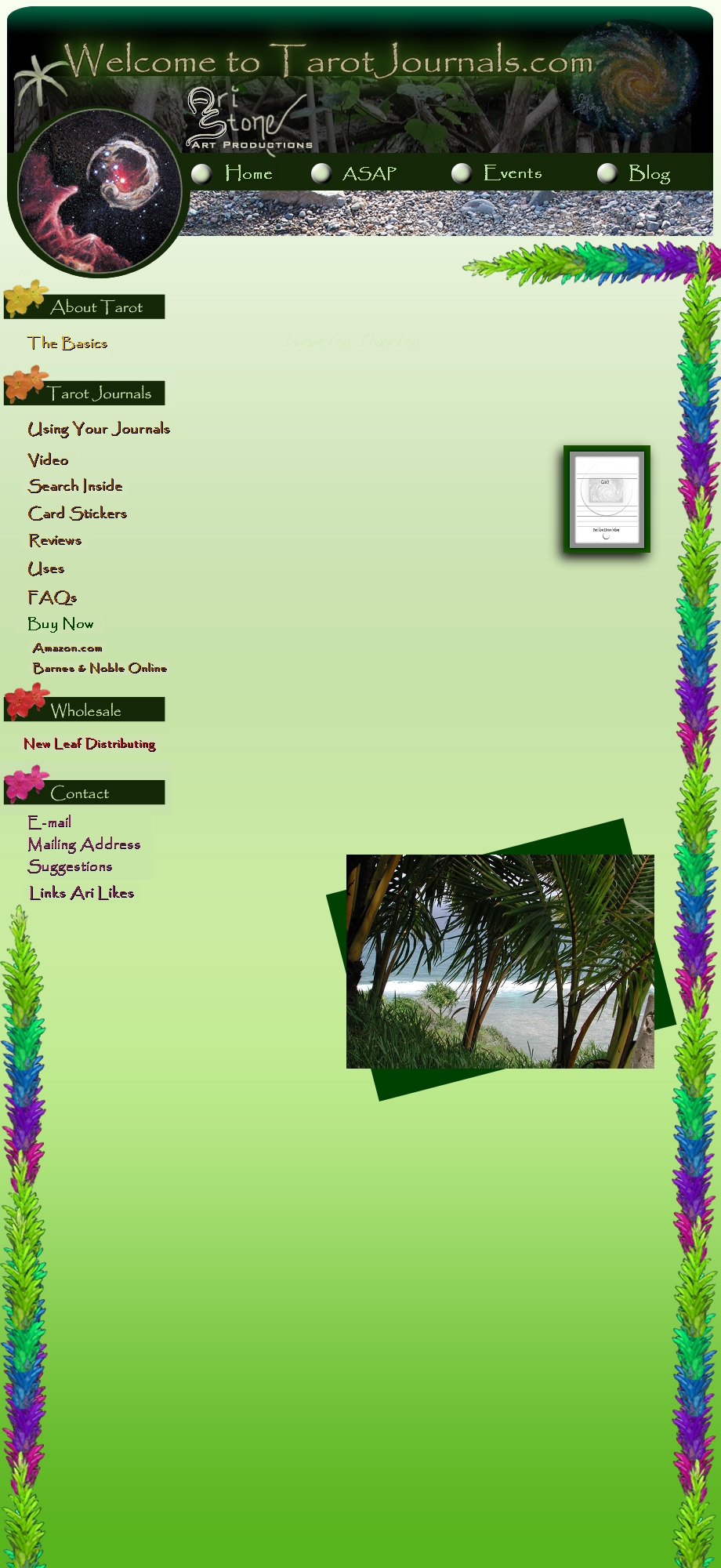 How do I use my Tarot Journal? It is very easy and fun. Visit Using Your Journals link or click the image to your right to see picture instructions. How do I use my Daily Spread Journal? In the same way you use the Tarot Journal. See the Card Stickers link for slight differences in Card Stickers. Daily Spread and Tarot Journal differ in use. Tarot Journal is for larger card readings of 6 - 22 cards per reading layout and Daily Spread Journal is for smaller and daily card meditations of 1-5 cards per reading layout. Do you have a package deal of Journals with tarot cards and a class? Not at this time. Be creative and explore the tarot or inspirational oracle cards, there are a lot of wonderful products created by wonderful people and a lot of excellent books on how to read tarot cards, as well as lots of great tarot classes offered online. I recommend Cyndy Green's online tarot classes. |